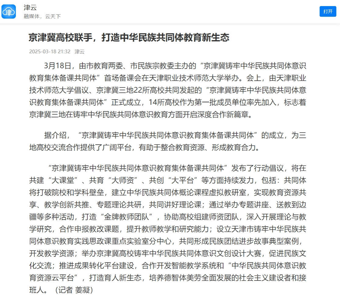今日津云报导“京津冀铸牢中华平易近族共通体认识教导全体备课配合体”正在黉舍诞生。